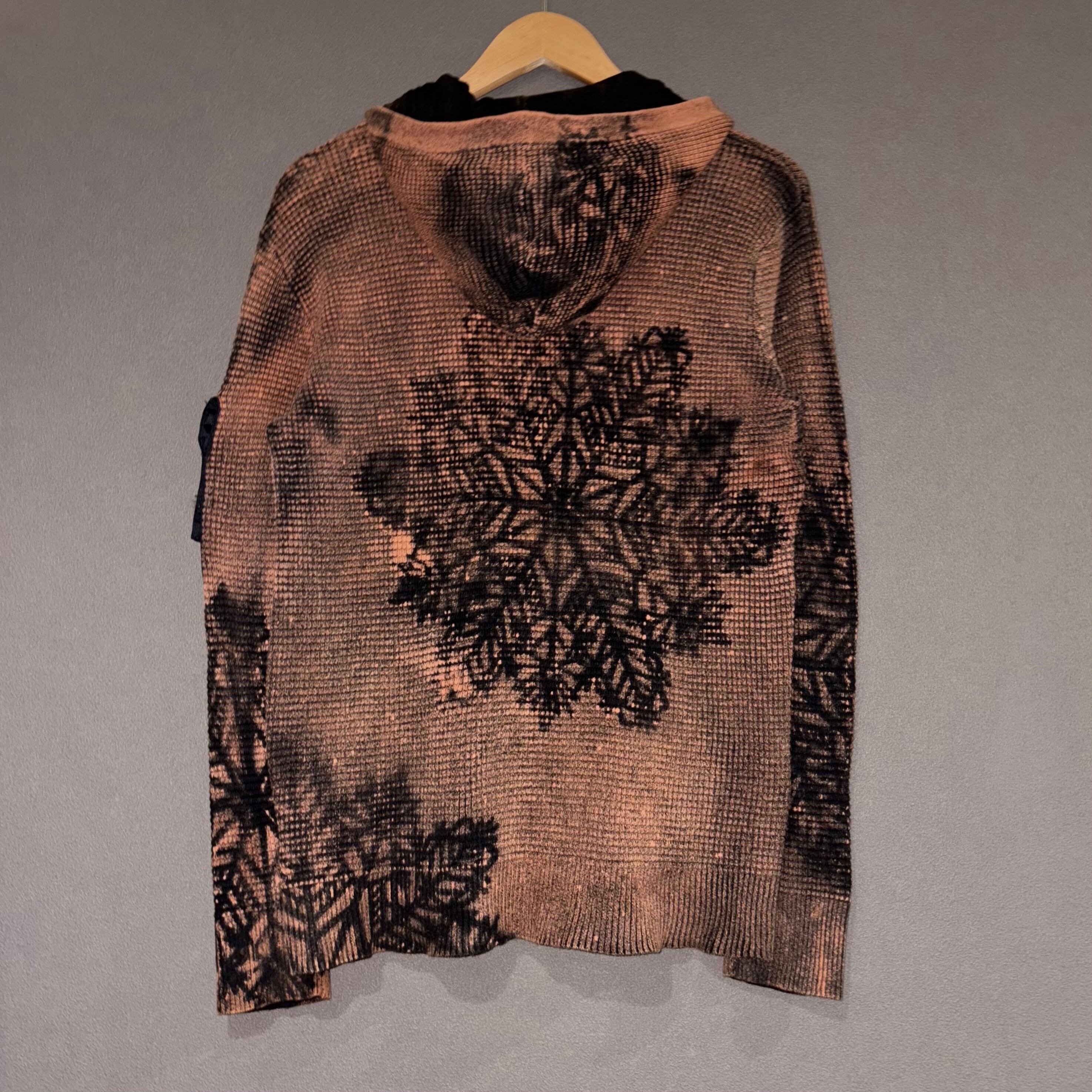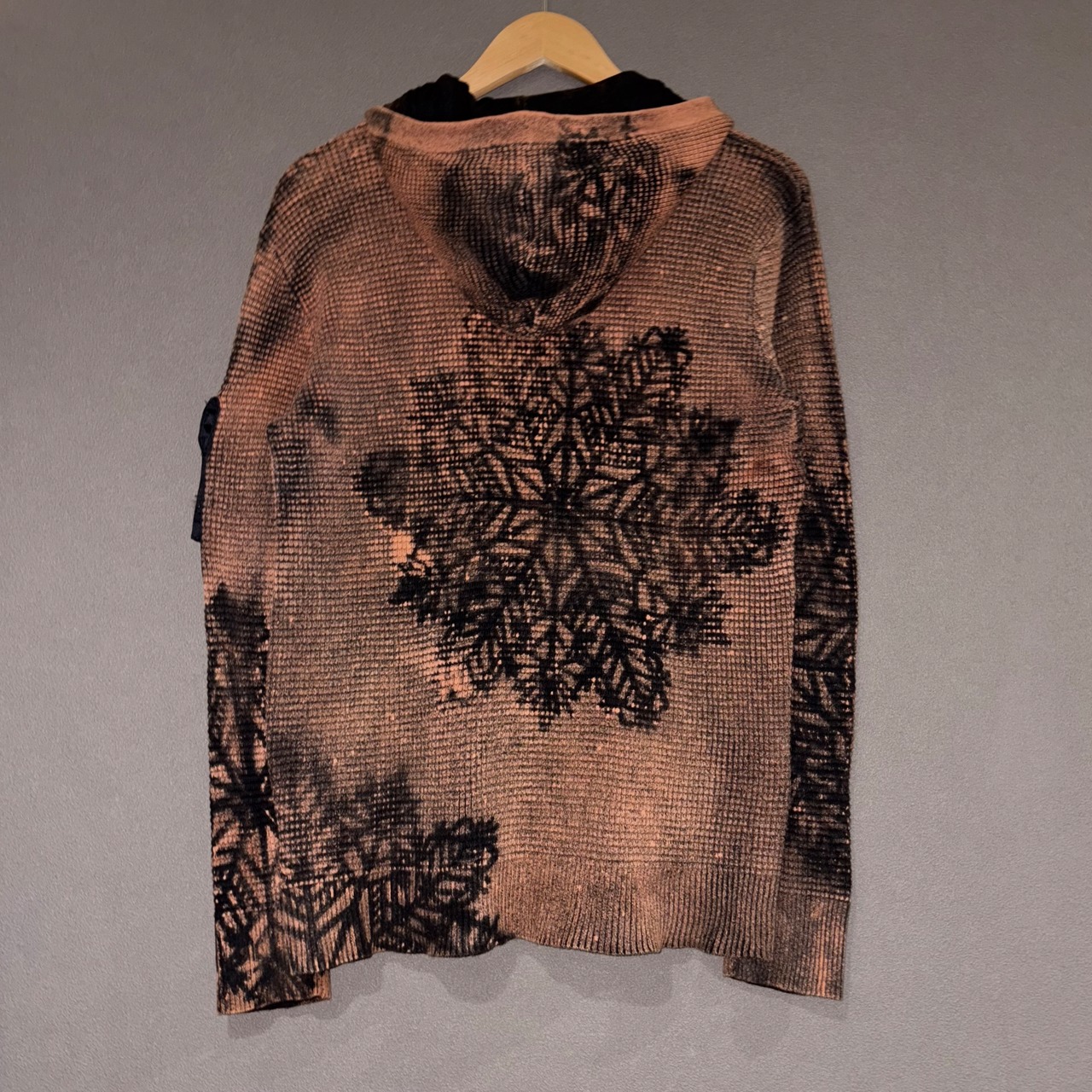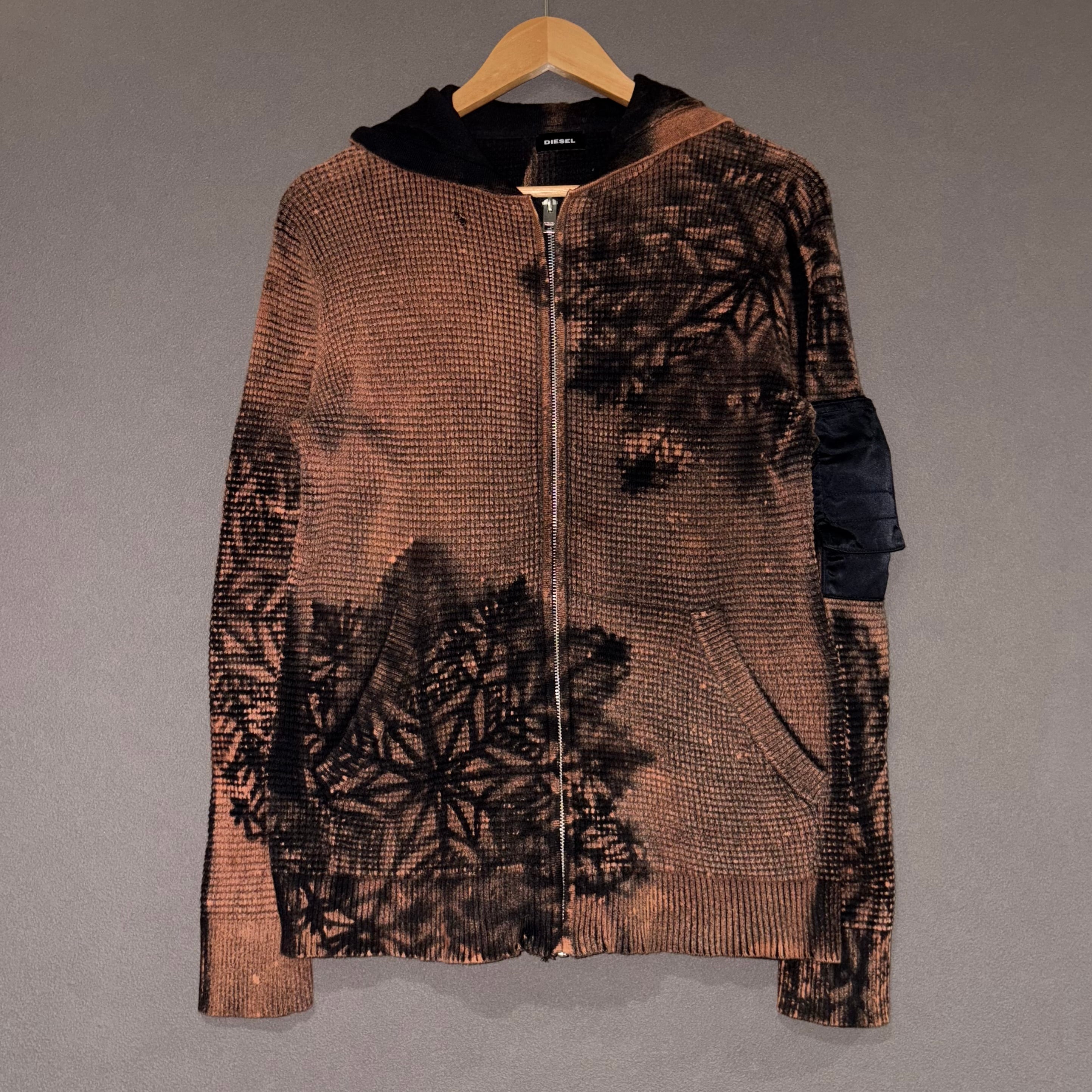 DIESELのサーマルジップフーディーをスノーフレークシルエットでリメイクしました。袖のナイロン素材のポケット部分以外を全体的に加工することで、ディテールを目立たせられるようにこだわりました。