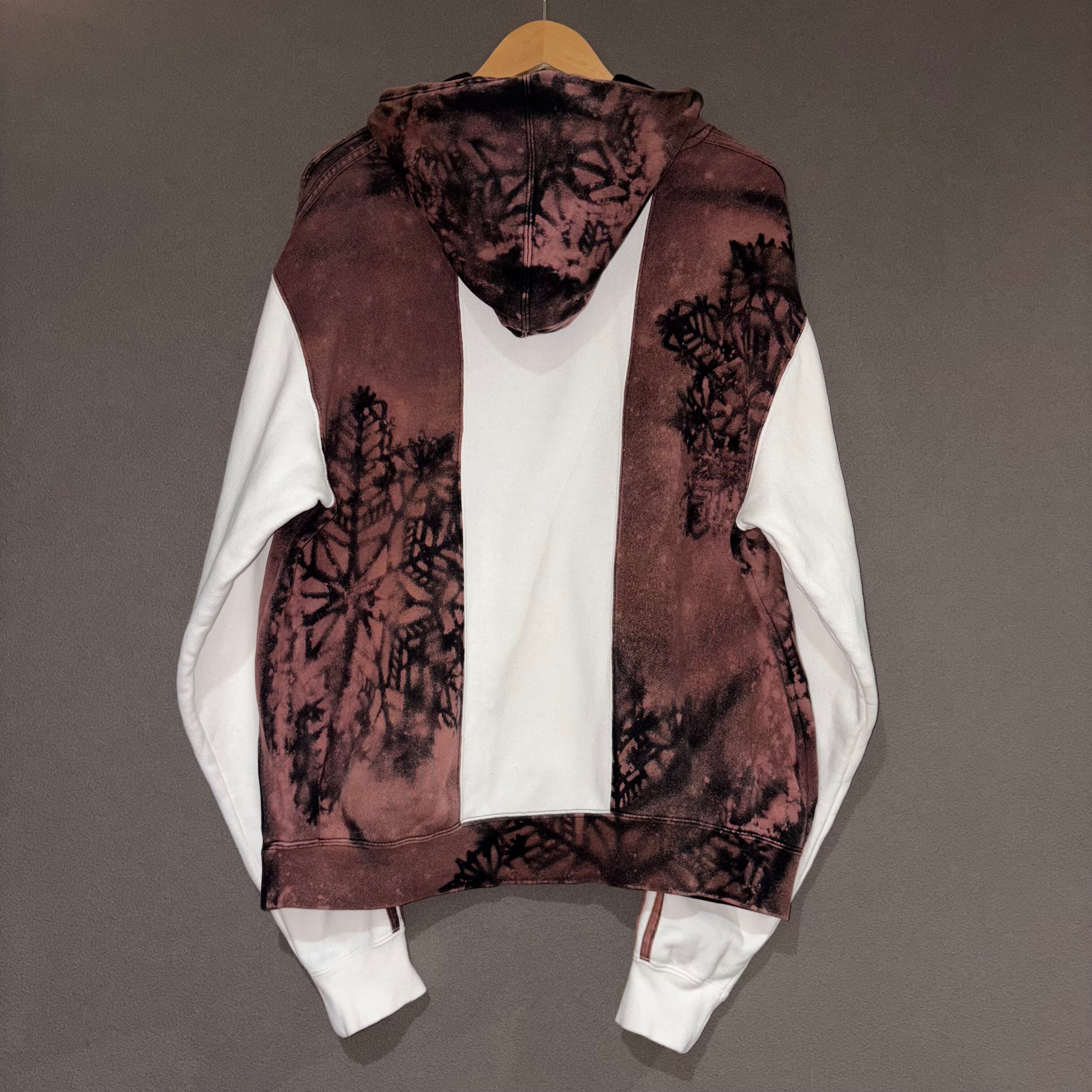バイカラーになっているadidasのフーディーをスノーフレークシルエットでリメイクしました。元々は黒だった部分を全体的に加工する事でバイカラーの良さを残しつつ個性のある1着になるようにこだわりました。